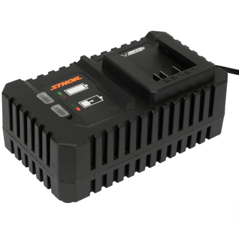 Ταχυφορτιστής για μπαταρίες Sthor 20V. Λειτουργεί με ρεύμα 4 A. Φορτίζει μια μπαταρία 2 Ah σε περίπου 30 λεπτά, 4 Ah - 60 λεπτά. Απενεργοποιείται αυτόματα μετά την ολοκλήρωση της φόρτισης. Η συσκευή διαθέτει διαγνωστική λειτουργία - εάν εντοπίσει κατεστραμμένα στοιχεία μπαταρίας, σταματά τη φόρτιση και σηματοδοτεί με ένα κόκκινο, παλλόμενο LED.