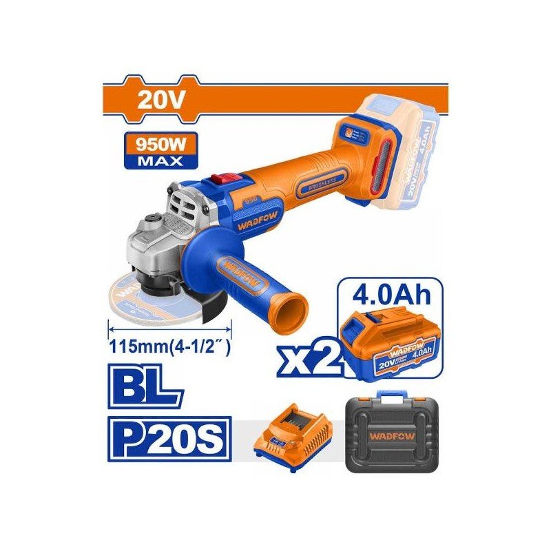 Γωνιακός τροχός της εταιρείας Wadfow, με μπαταρία λιθίου 20V χωρητικότητας 4Ah. Δέχεται δίσκους με διάμετρο έως και 115mm, έτσι καλύπτει ικανοποιητικά τις περισσότερες ερασιτεχνικές και επαγγελματικές εργασίες καθώς μπορεί να κόψει σε βάθος έως 3 εκατοστά. Ακόμη, έχει δυνατότητα προσαρμογής της ταχύτητας έως 9000rpm, έτσι βοηθάει σε εργασίες που απαιτούν λιγότερη ταχύτητα και περισσότερη λεπτομέρεια όπως λείανση, τρόχισμα και DIY κατασκευές. Τέλος, διαθέτει νέας τεχνολογίας κινητήρα χωρίς ψύκτρες, που προσφέρει μεγαλύτερη αυτονομία, διάρκεια ζωής και μειώνονται οι ανάγκες συντήρησης αλλά και οι προμήθειες ανταλλακτικών.