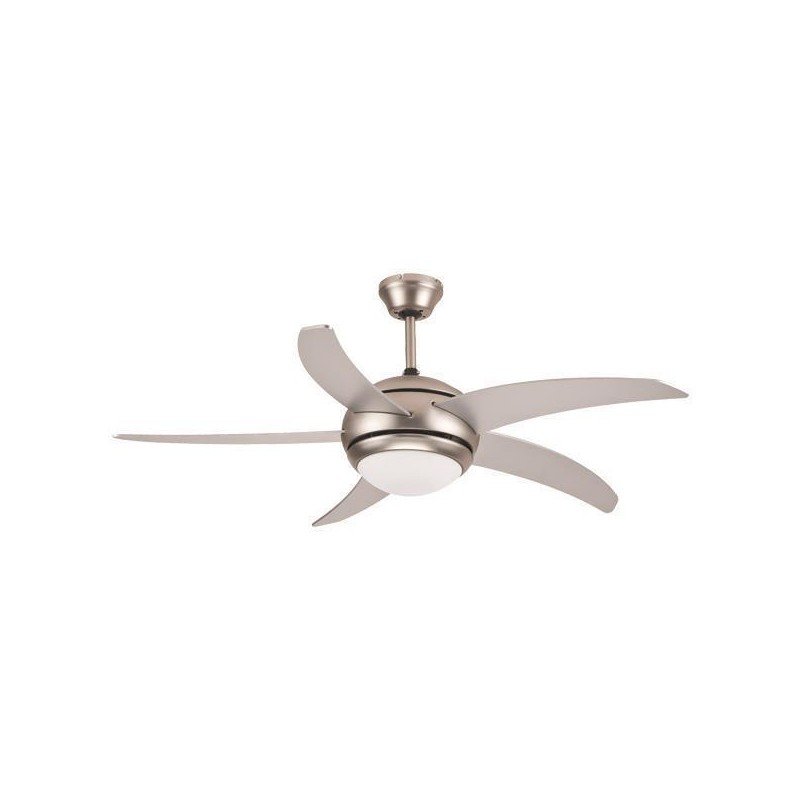 Μονόφωτος ανεμιστήρας οροφής, με τηλεχειριστήριο σε νίκελ ματ χρώμα. Ιδανικός για χώρους 20m². Δυνατότητα χρήσης χρονοδιακόπτη έως 8 ώρες και αντίστροφης περιστροφής. Κατάλληλος για χειμώνα και καλοκαίρι. Διαθέτει υποδοχή για 1 λάμπα με ντουί Ε27, 5 φτερωτές διαμέτρου Φ122, 3 σκάλες με μέγιστη ταχύτητα 180rpm απόδοσης 70W. Καθαρό βάρος 6.2kg, ήχος λειτουργίας εώς 40dB. Εγγύηση 2 έτη by Eurolamp.